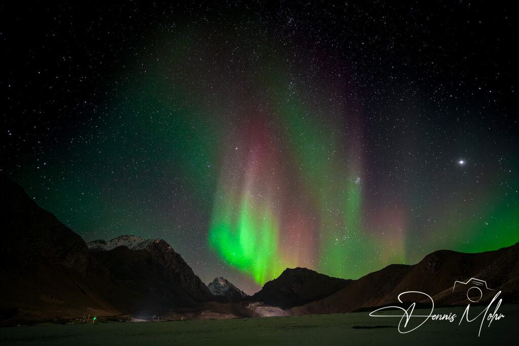 Dieses Foto ist nur wenige Meter von meiner Unterkunft aus entstanden. Ich war eigentlich schon fertig, habe dann aber auf dem Heimweg gesehen, wie die Aurora Borealis noch mal so richtig loslegt.
